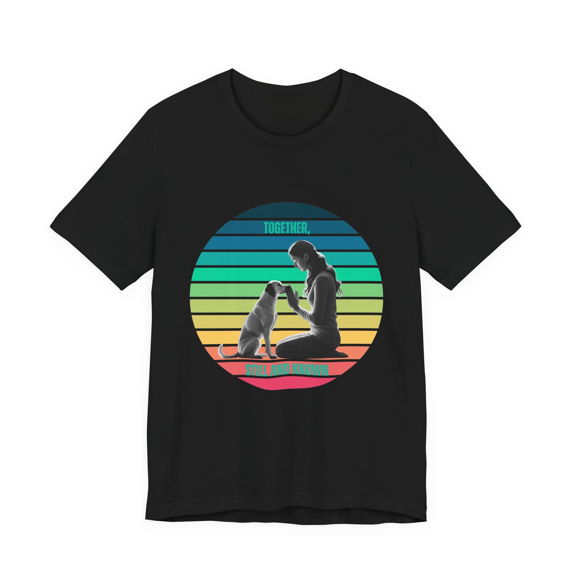 This vintage-inspired Christian t-shirt features a heartfelt silhouette of a woman kneeling as her dog gently nuzzles her hand, framed by a warm retro sunset. Drawing from Psalm 46:10, “Be still and know that I am God,” the design captures a quiet moment of peace, trust, and divine presence.