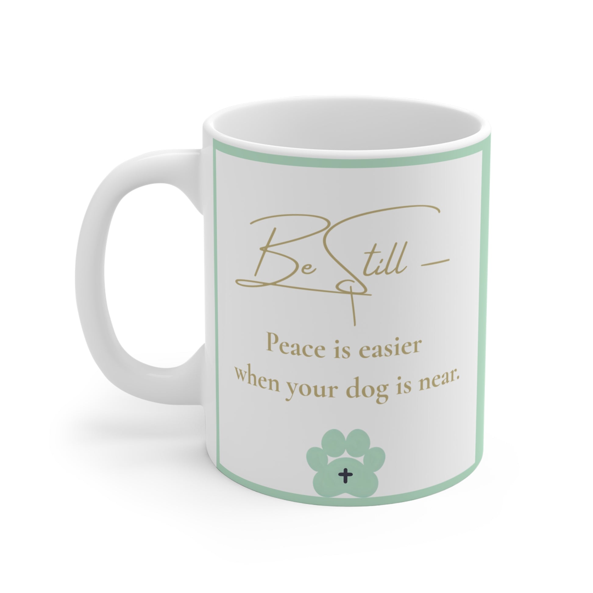 Be Still Mug – “Peace is Easier When Your Dog Is Near” – Christian Dog Lover Mug with Sage Green Paw Accent – Front & Back Design – Inspirational Scripture Gift