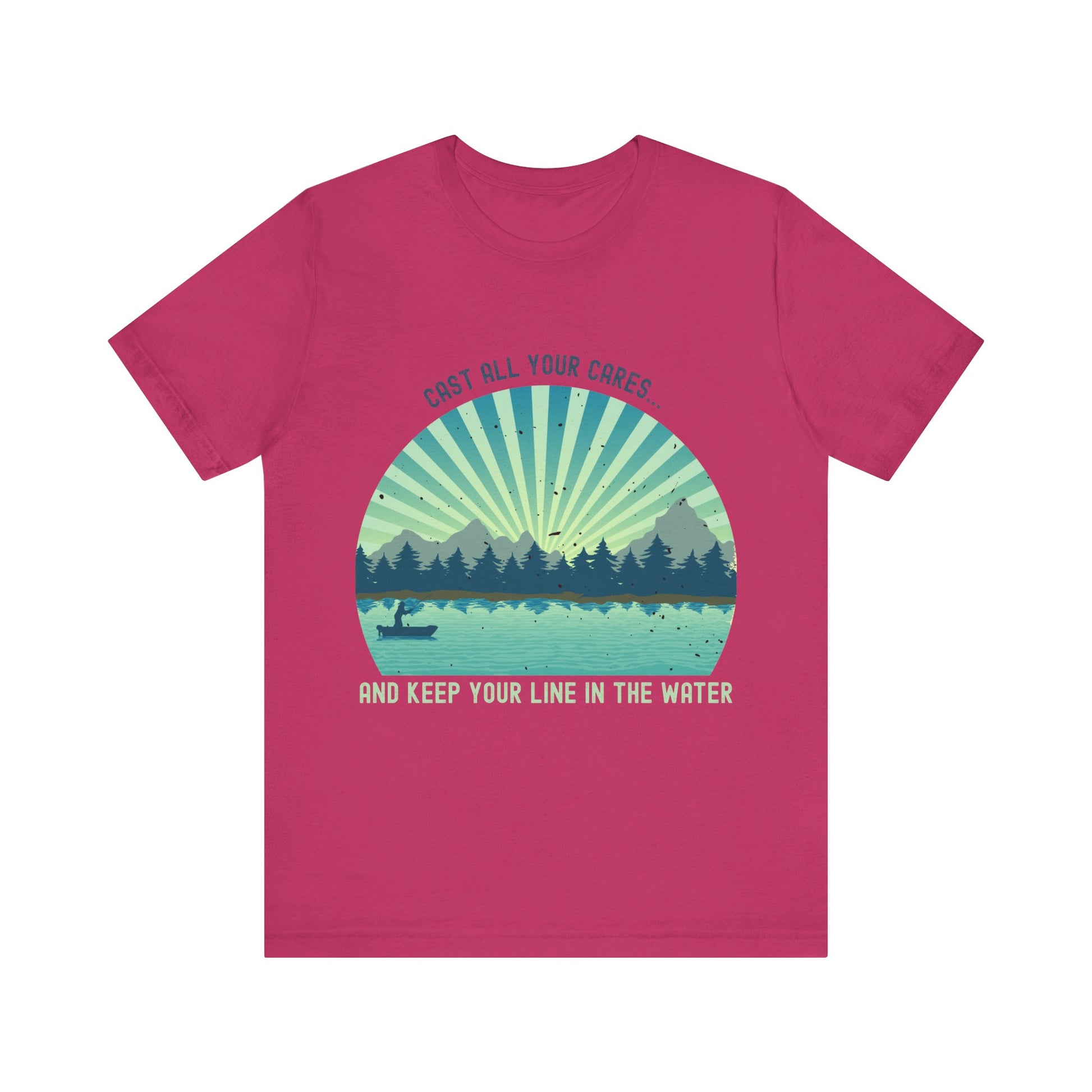 Let go and trust the process with this retro-inspired fishing T-shirt that combines spiritual encouragement and overall wisdom. Featuring the uplifting phrase “Cast All Your Cares and Keep Your Line in the Water” and a vintage-style image of a person fishing, this design is perfect for those who find peace in nature and strength in faith.