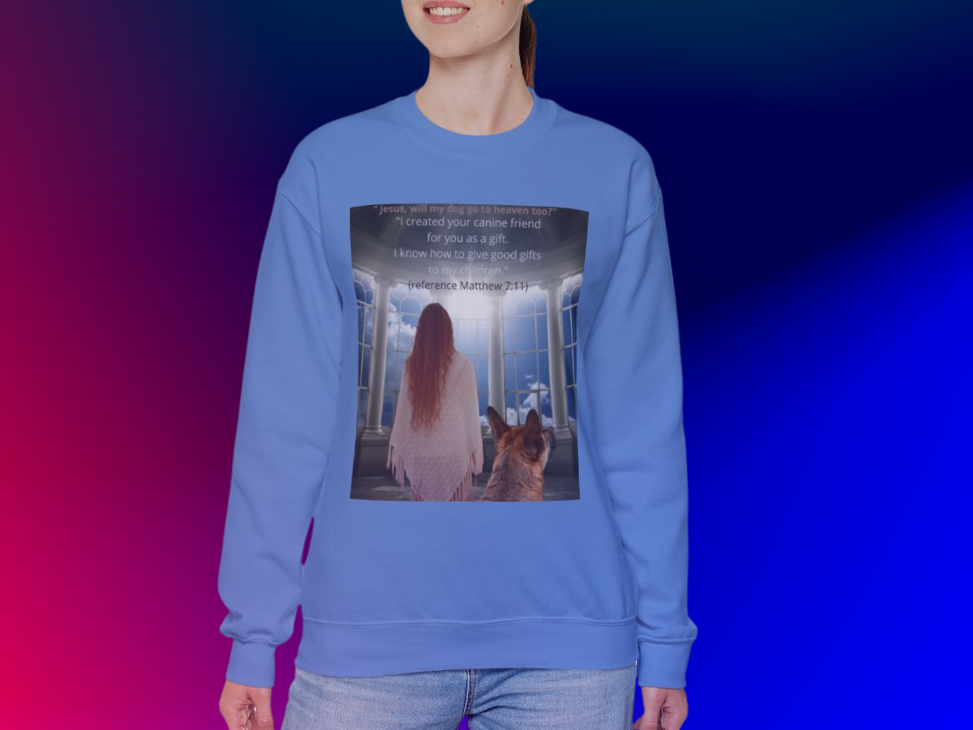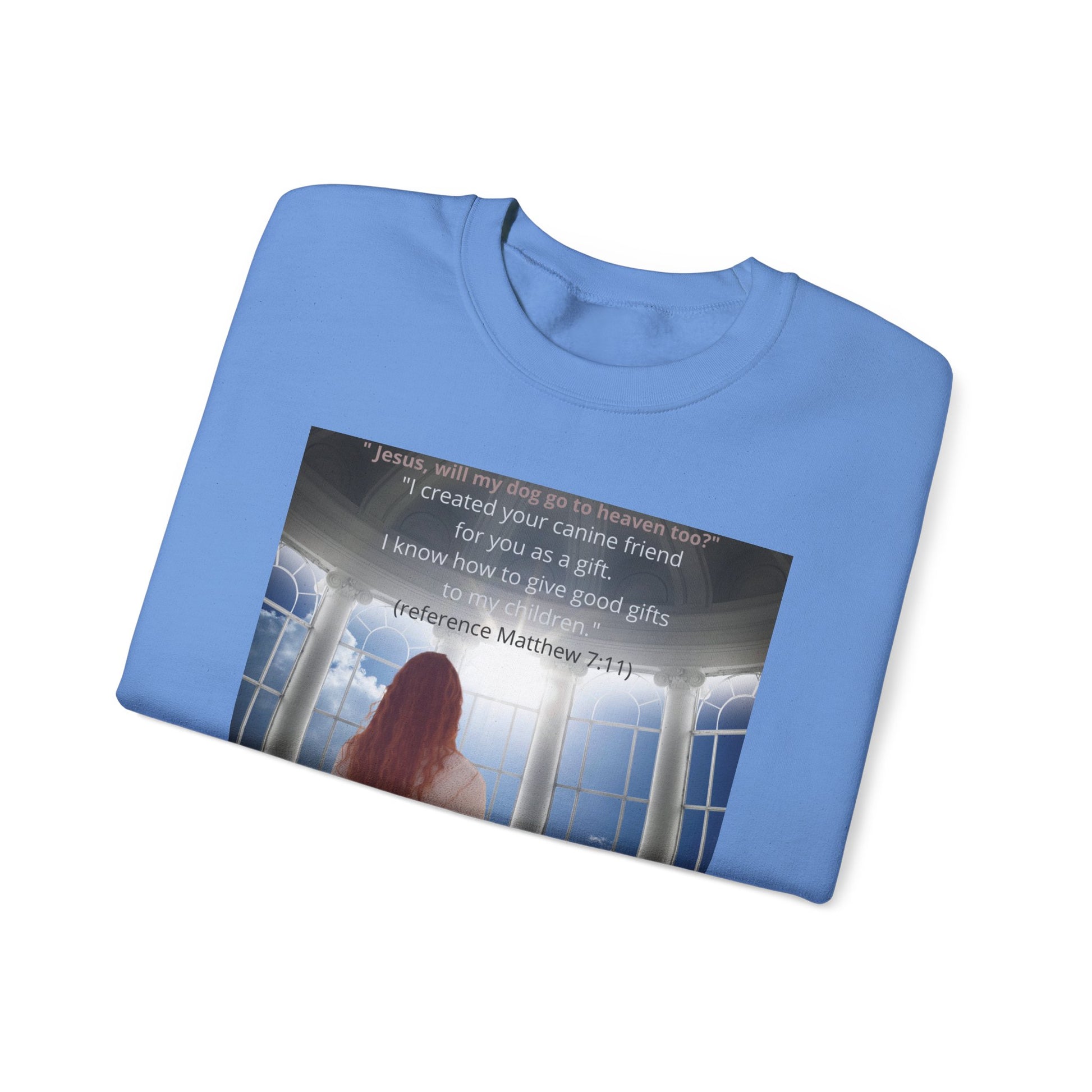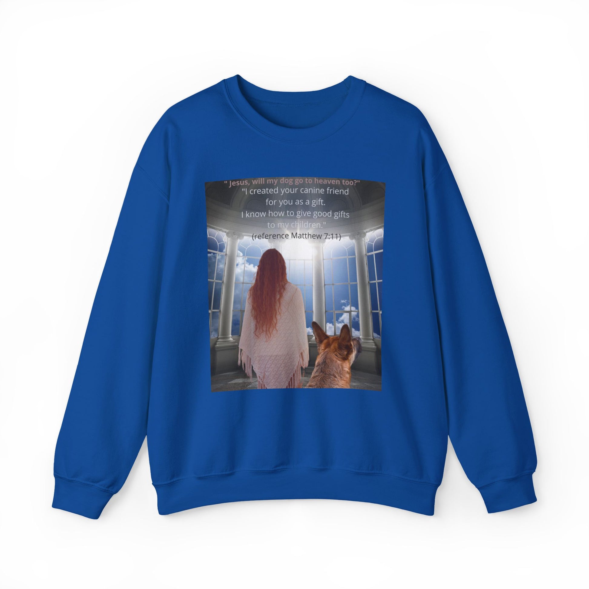 This touching sweatshirt features a heartfelt image of a person and their loyal dog gazing up to heaven, asking the deep, emotional question: "Will my dog go to heaven?" And of course the encouraging answer. A perfect gift for dog lovers, pet owners or anyone who cherishes the bond with their furry companion. Crafted with premium materials for comfort and warmth, this emotional design captures the love, loyalty and spiritual connection between humans and their dogs. Whether for daily wear or a sentimental gift, this sweatshirt is a beautiful reminder of the unbreakable bond between you and your pet.