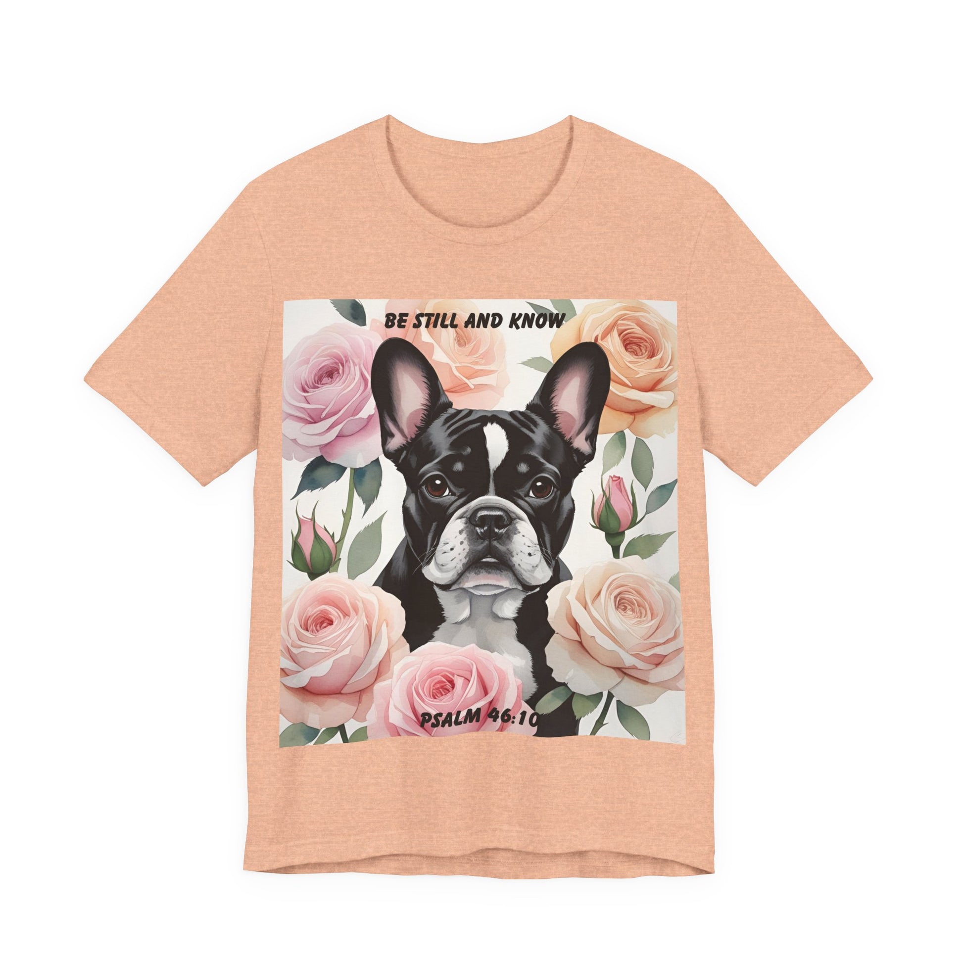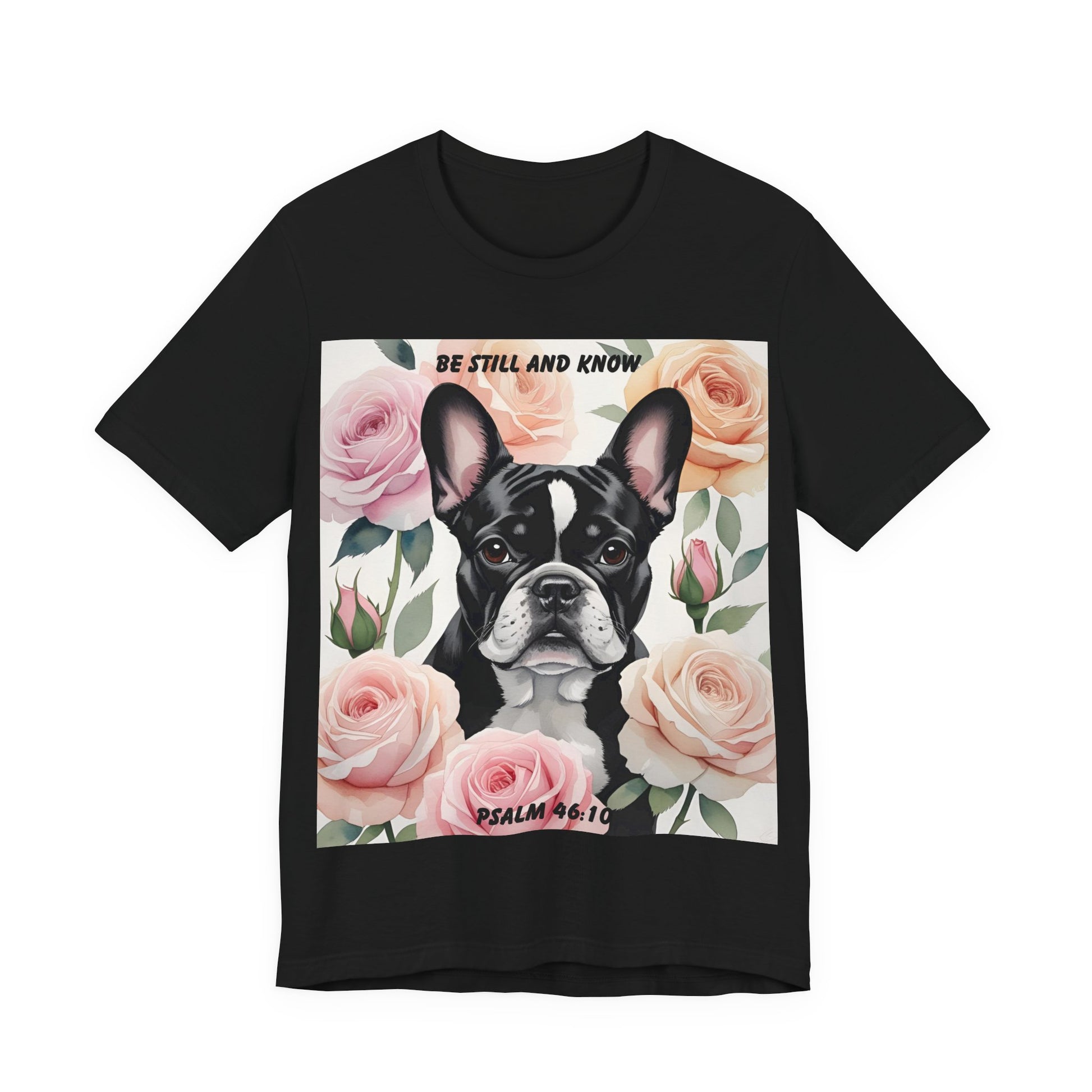 French Bulldog Watercolor Roses T-Shirt – "Be Still and Know" – Psalm 46:10 Christian Dog Lover Gift