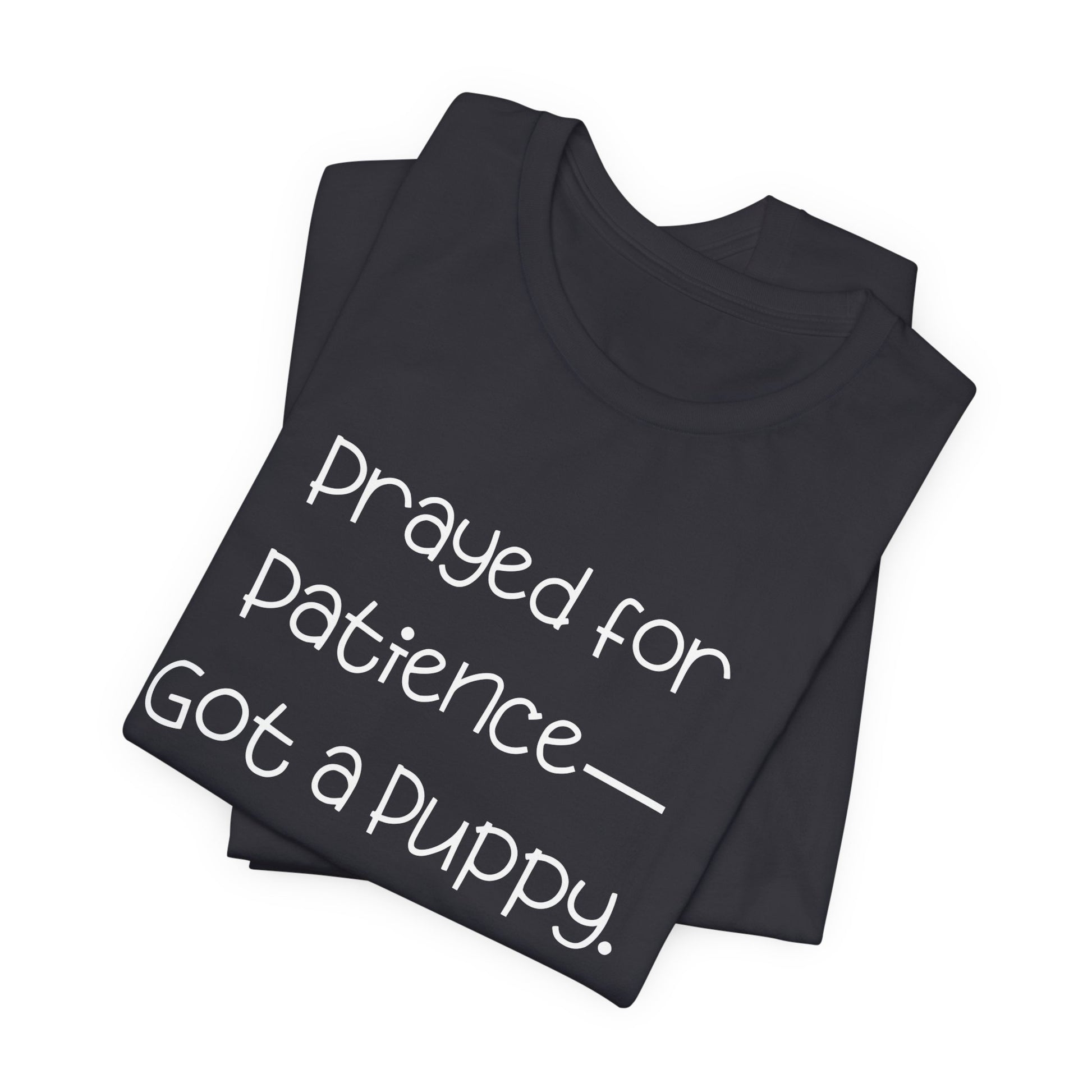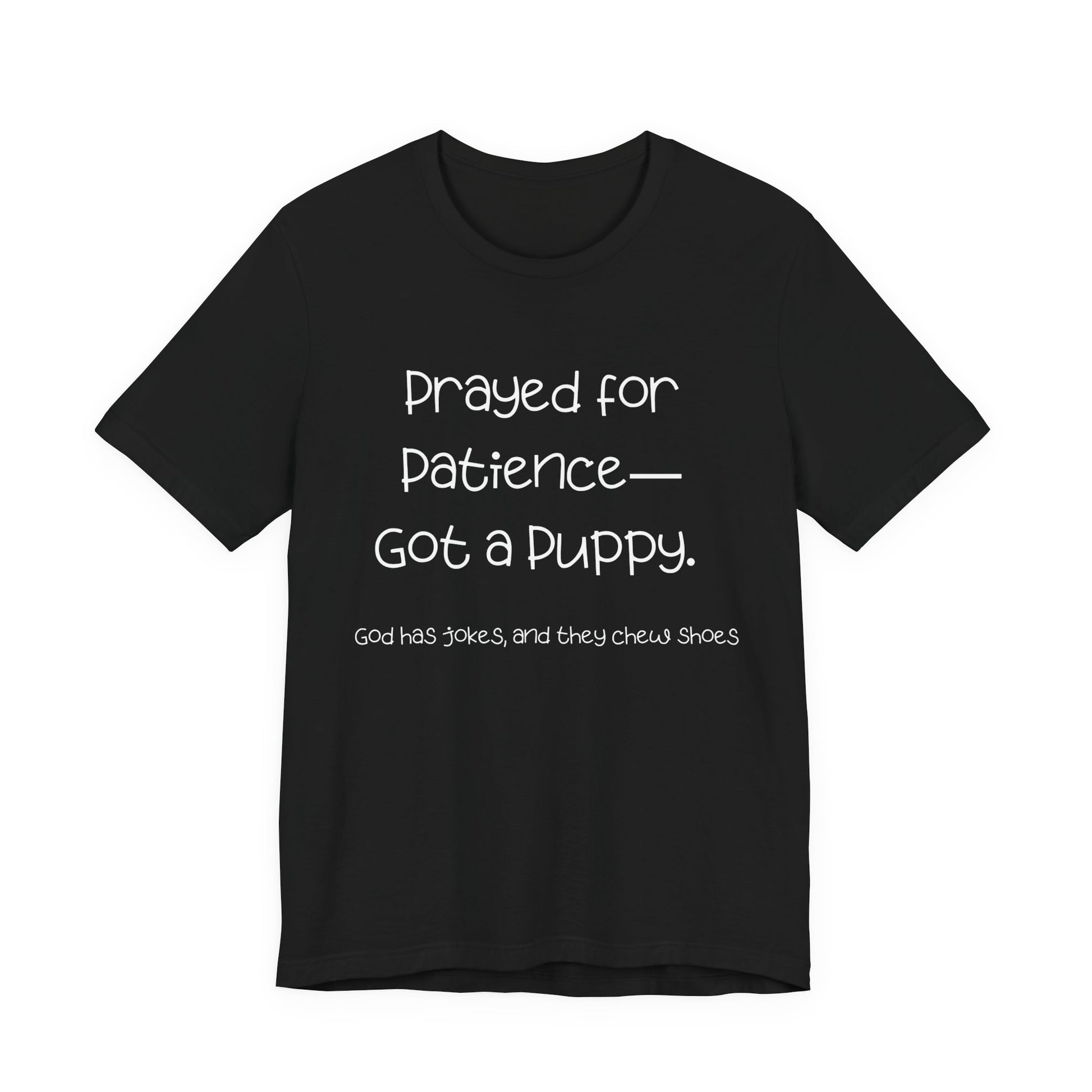 Funny Dog Lover T-Shirt – “Prayed for Patience, Got a Puppy” Christian Pet Humor Tee – God Has Jokes and They Chew Shoes