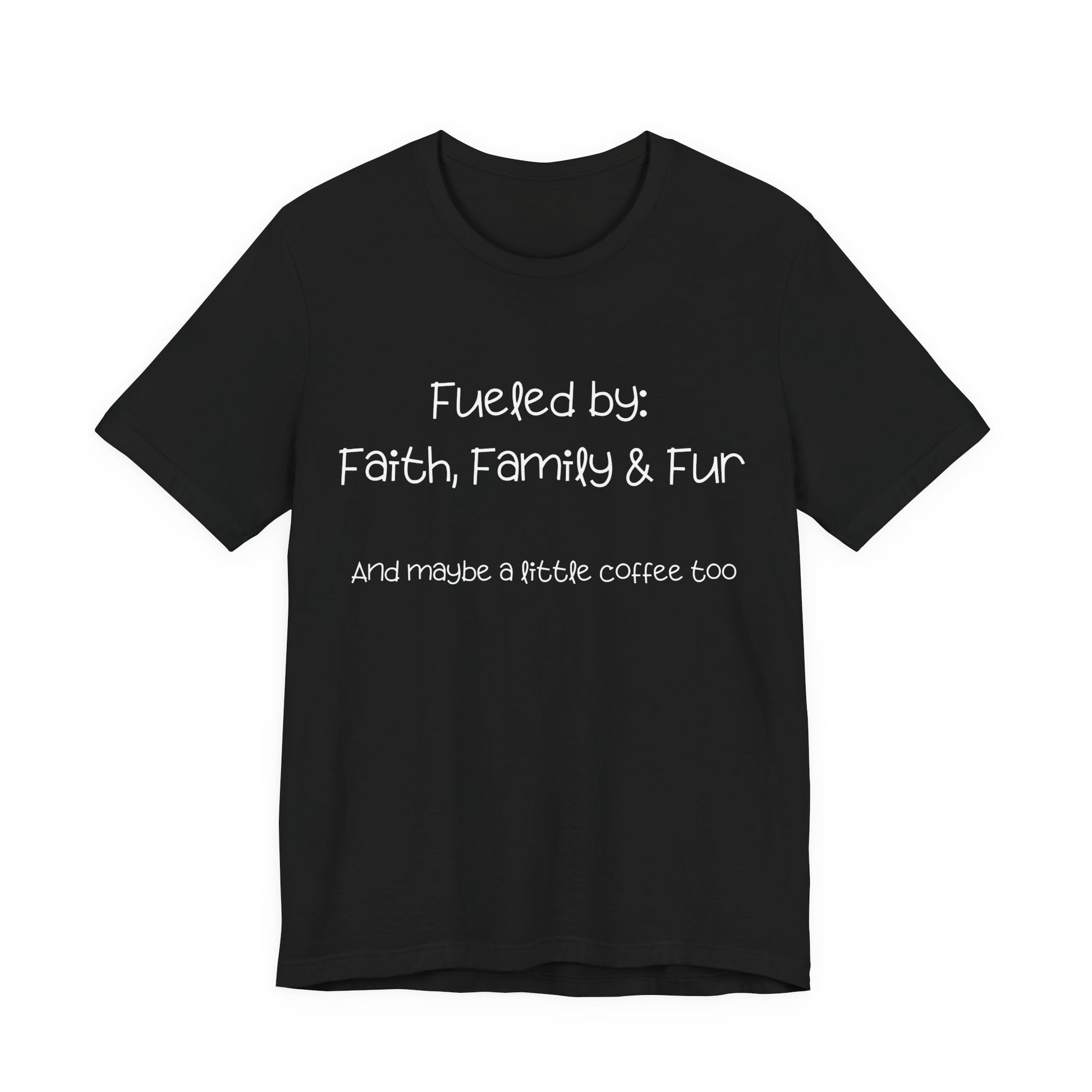 Funny Faith and Dog Mom T-Shirt – “Fueled by Faith, Family and Fur” Christian Pet Lover Tee with Coffee Humor