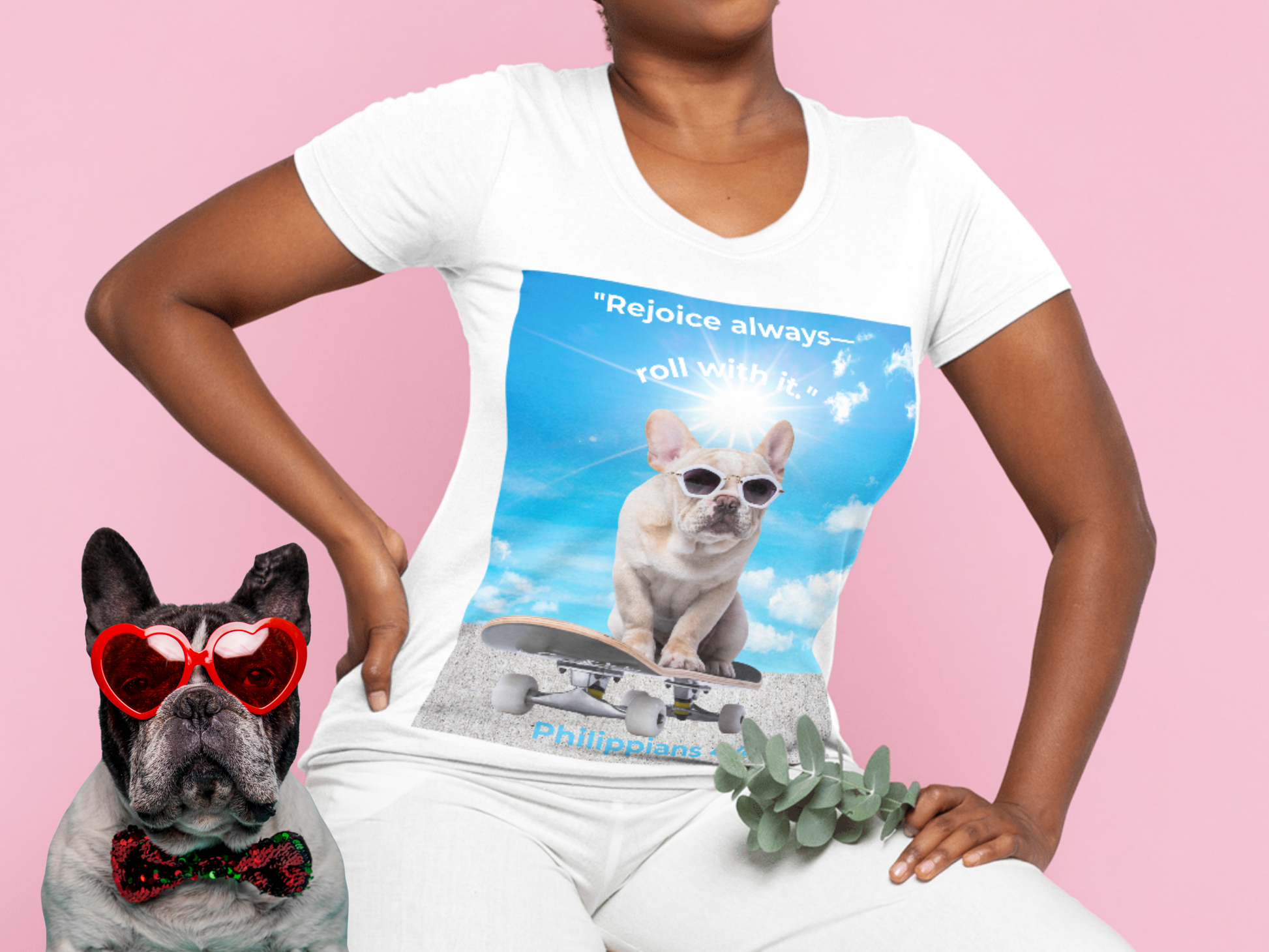 French Bulldog Skateboard T-Shirt – "Rejoice Always, Roll With It" – Philippians 4:4 Christian Dog Lover Gift
