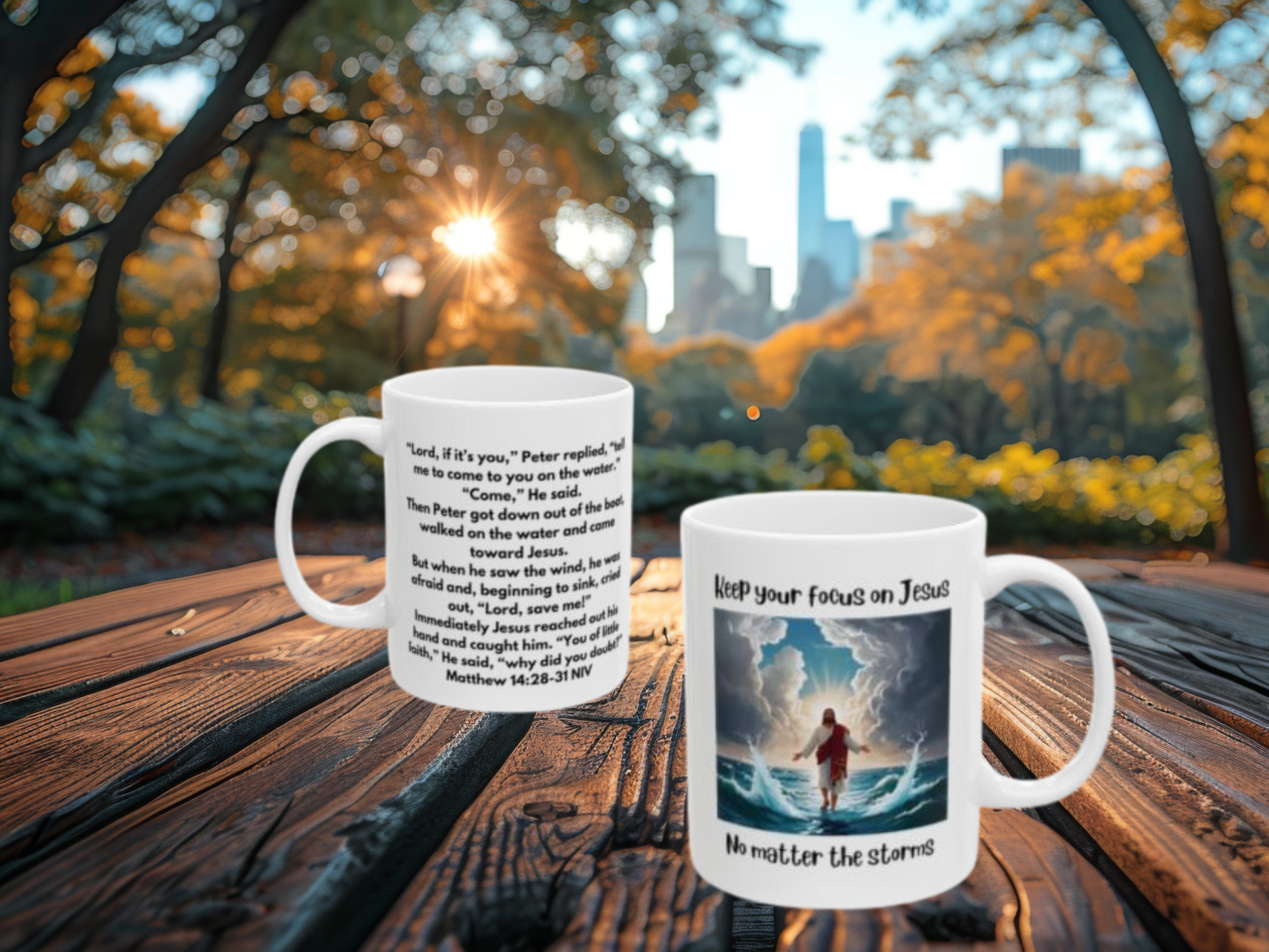 Find strength and inspiration with our Focus on Jesus mug, designed to remind you to keep your focus on Jesus, even in life’s toughest storms. Perfect for daily use or as a thoughtful gift, this mug serves as a powerful reminder to be sure we are not taking our eyes off Jesus, particularly in the storms of life. Whether you're sipping your morning coffee or reflecting on our Savior, this mug will encourage you to keep your eyes on Jesus no matter the storm."