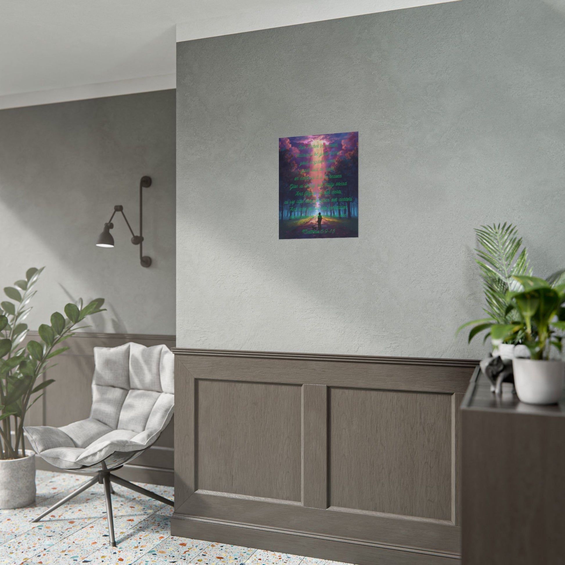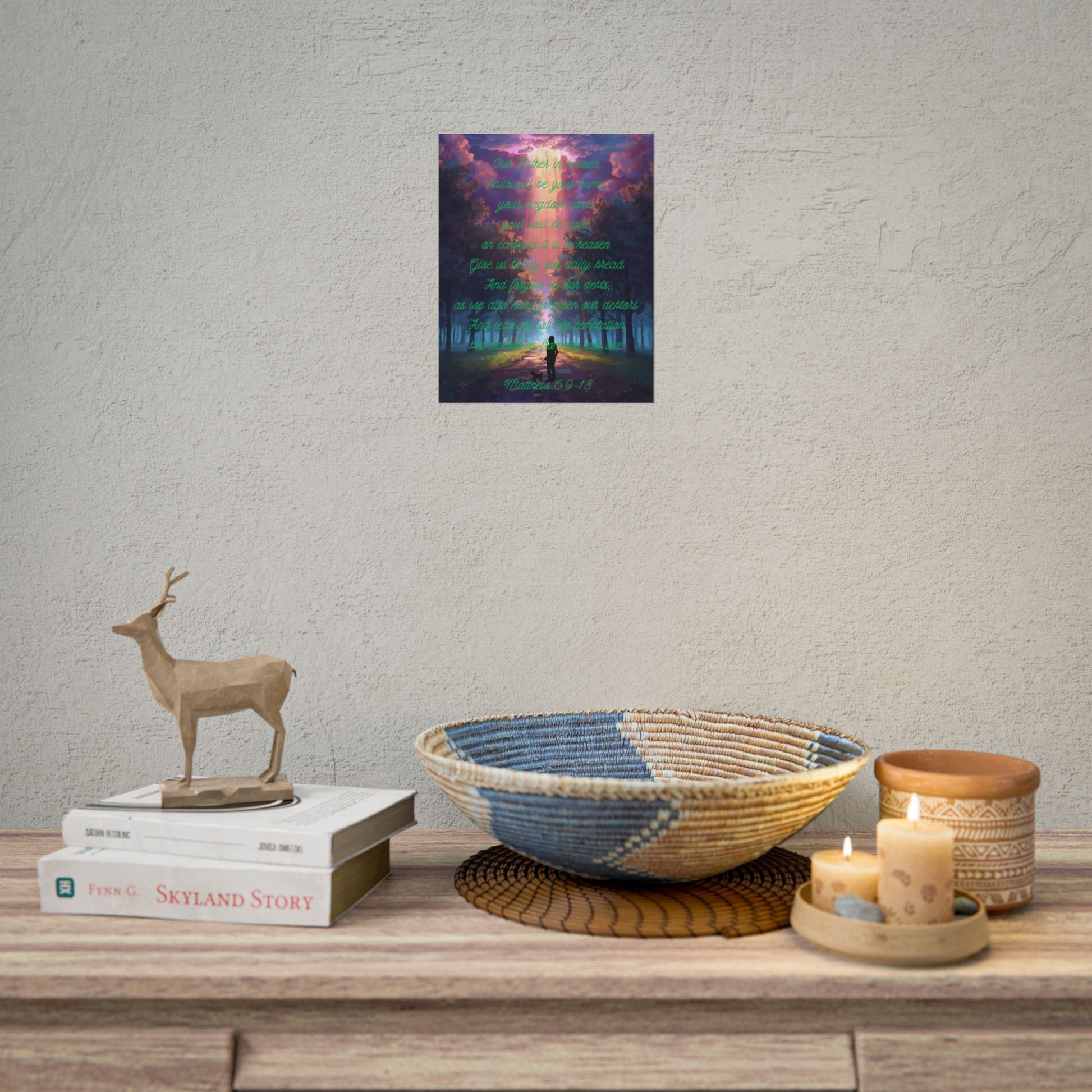 Find peace and encouragement with this Lord’s Prayer wall poster, beautifully designed with the silhouette of a woman and her dog standing on a forest trail that opens into radiant light pouring from the clouds. Overlayed with Matthew 6:9-13, this inspirational Christian artwork reflects both the comfort of prayer and the companionship of faithful journeys. Perfect for bedrooms, living rooms, or prayer spaces, it makes a meaningful gift for dog lovers and believers alike.