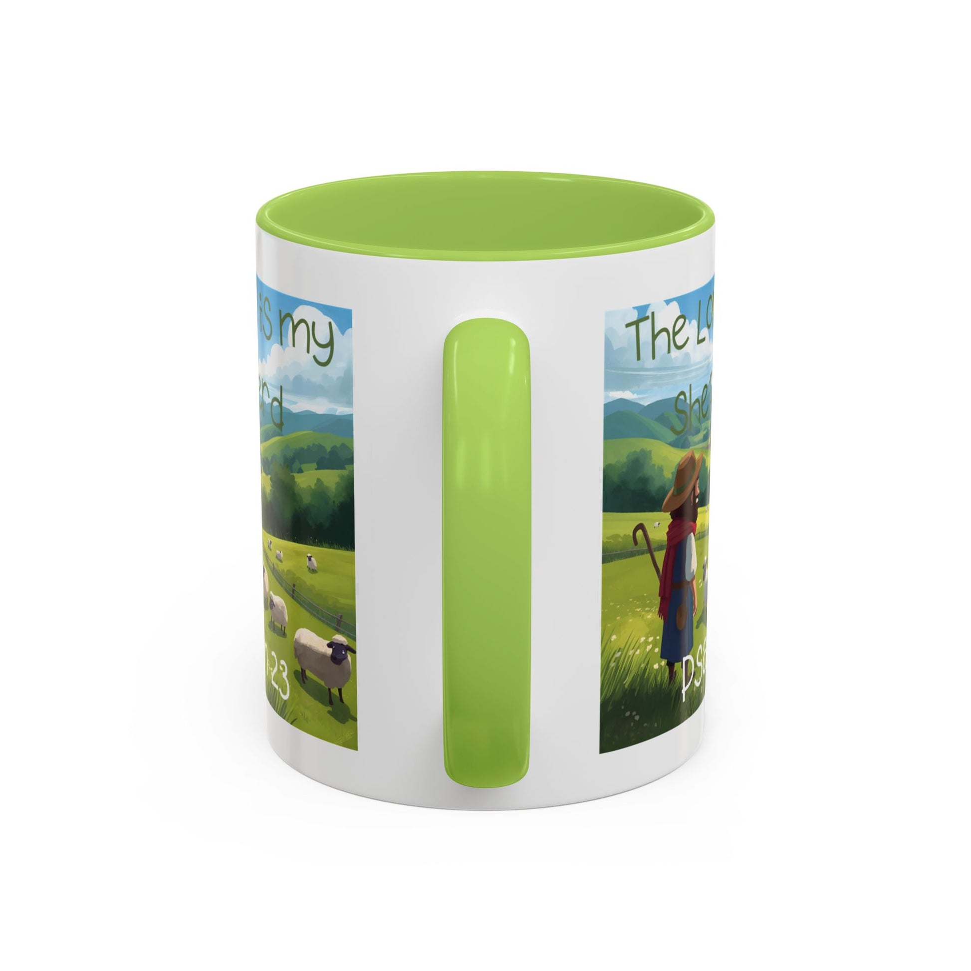A vibrant and encouraging mug featuring a cartoon art design on a light green accent, inspired by Psalm 23. Perfect for those looking to draw near to the Lord daily. Suitable for microwave and dishwasher use, available in two sizes, with vibrant color and a glossy finish.