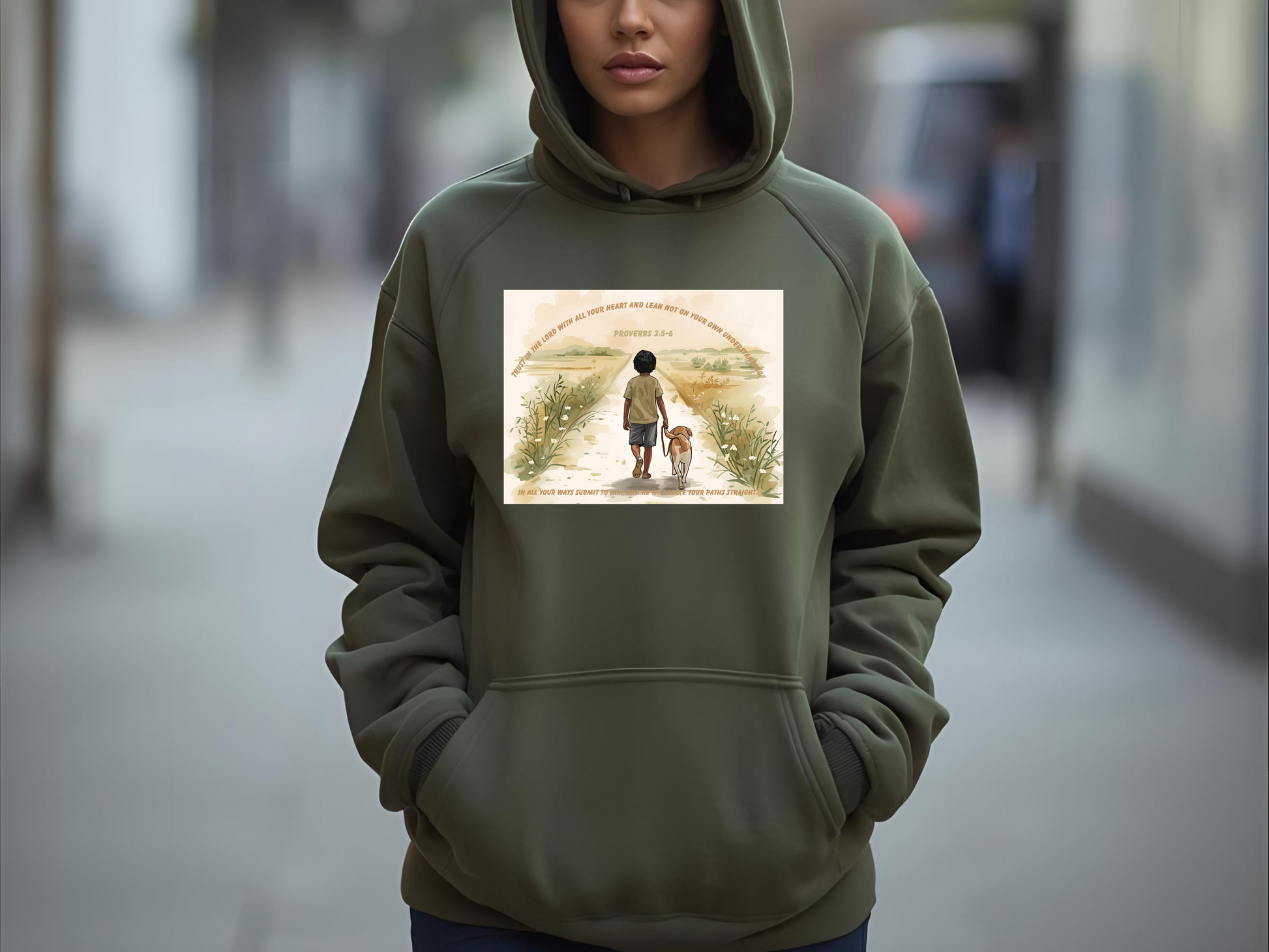 Carry God’s promise with you wherever you go in this Proverbs 3:5–6 hooded sweatshirt. Featuring the beloved scripture, “Trust in the Lord with all your heart and lean not on your own understanding; in all your ways submit to him, and he will make your paths straight”, this design shows a child walking with a loyal dog on a straight path—symbolizing innocence, trust, and God’s faithful guidance.