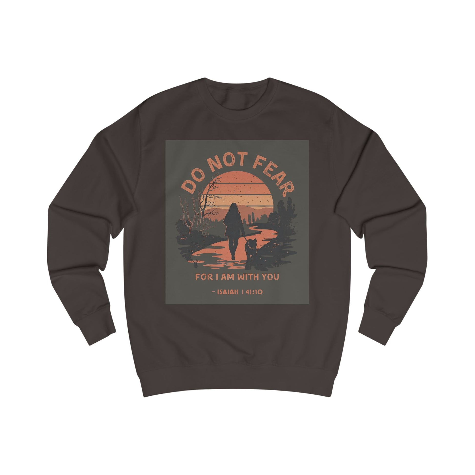 This unisex sweatshirt features a retro style design with a reference to Isaiah 41:10, showing a woman and dog walking a path. The design gives off a comforting and encouraging vibe, perfect for those seeking reassurance and faith. It can be a great addition to someone's casual wardrobe, especially for those who find peace and strength in spirituality. Suitable for holidays like Christmas, Easter, or even everyday wear.