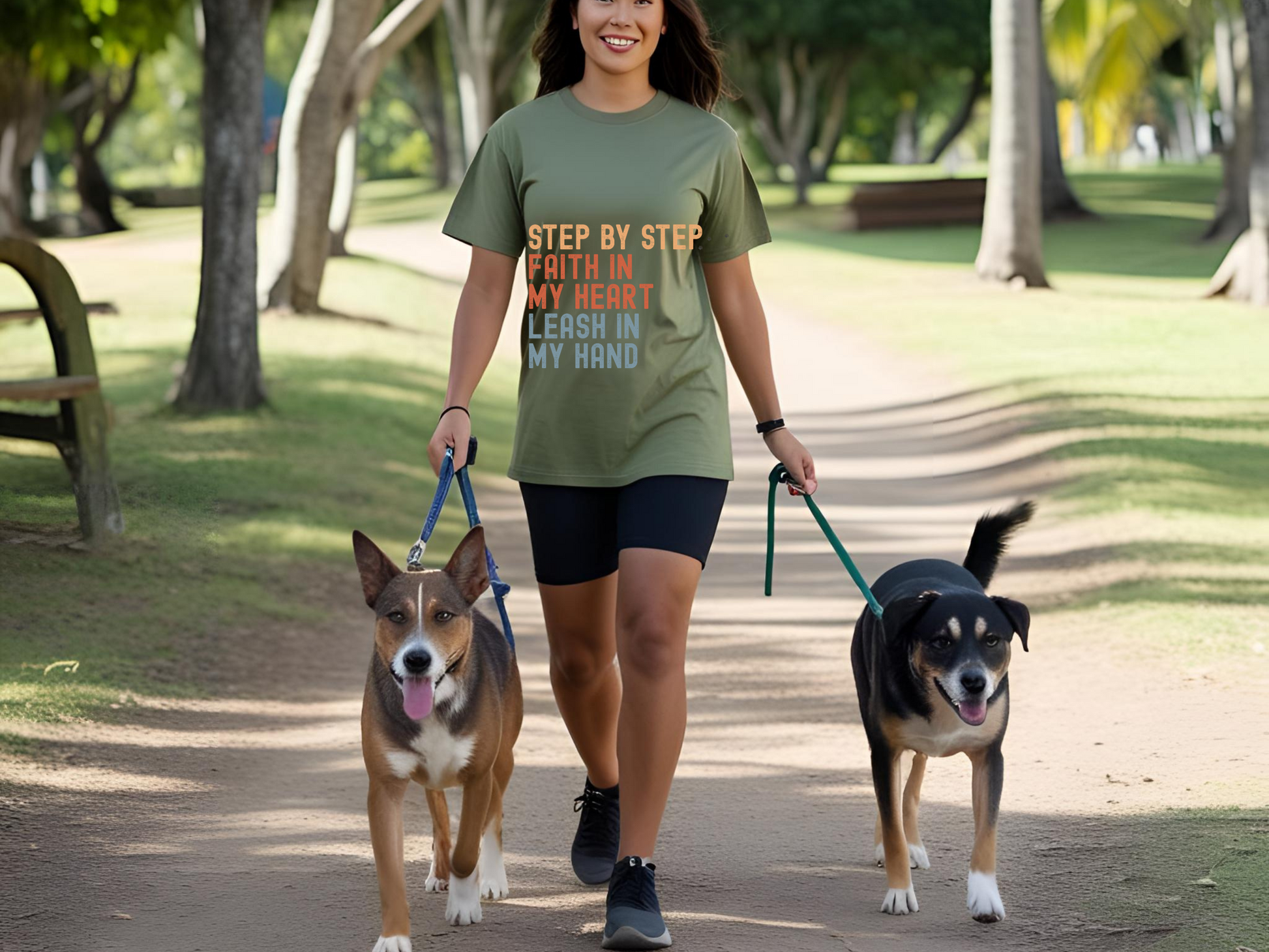Walk through life with purpose and paws. This minimalist T-shirt features the uplifting message: "Step by step, faith in my heart, leash in my hand." Perfect for dog lovers on a spiritual or personal journey, it’s a wearable reminder that you're never walking alone. Whether you're on a morning walk with your pup or navigating life's ups and downs, this design blends faith, hope, and furry companionship in one meaningful statement. Made for comfort, created for encouragement.