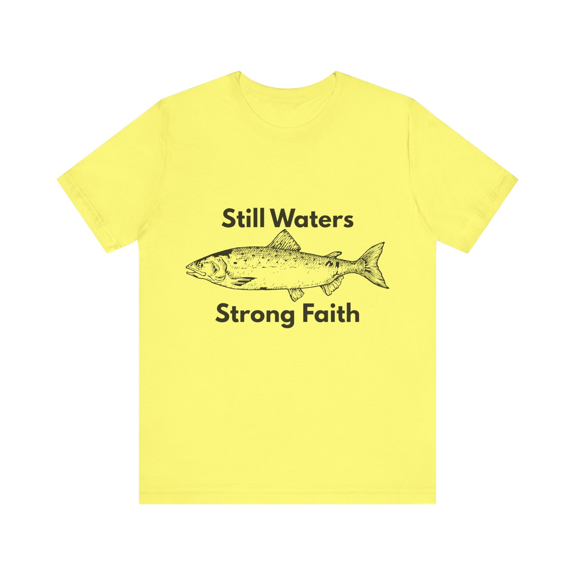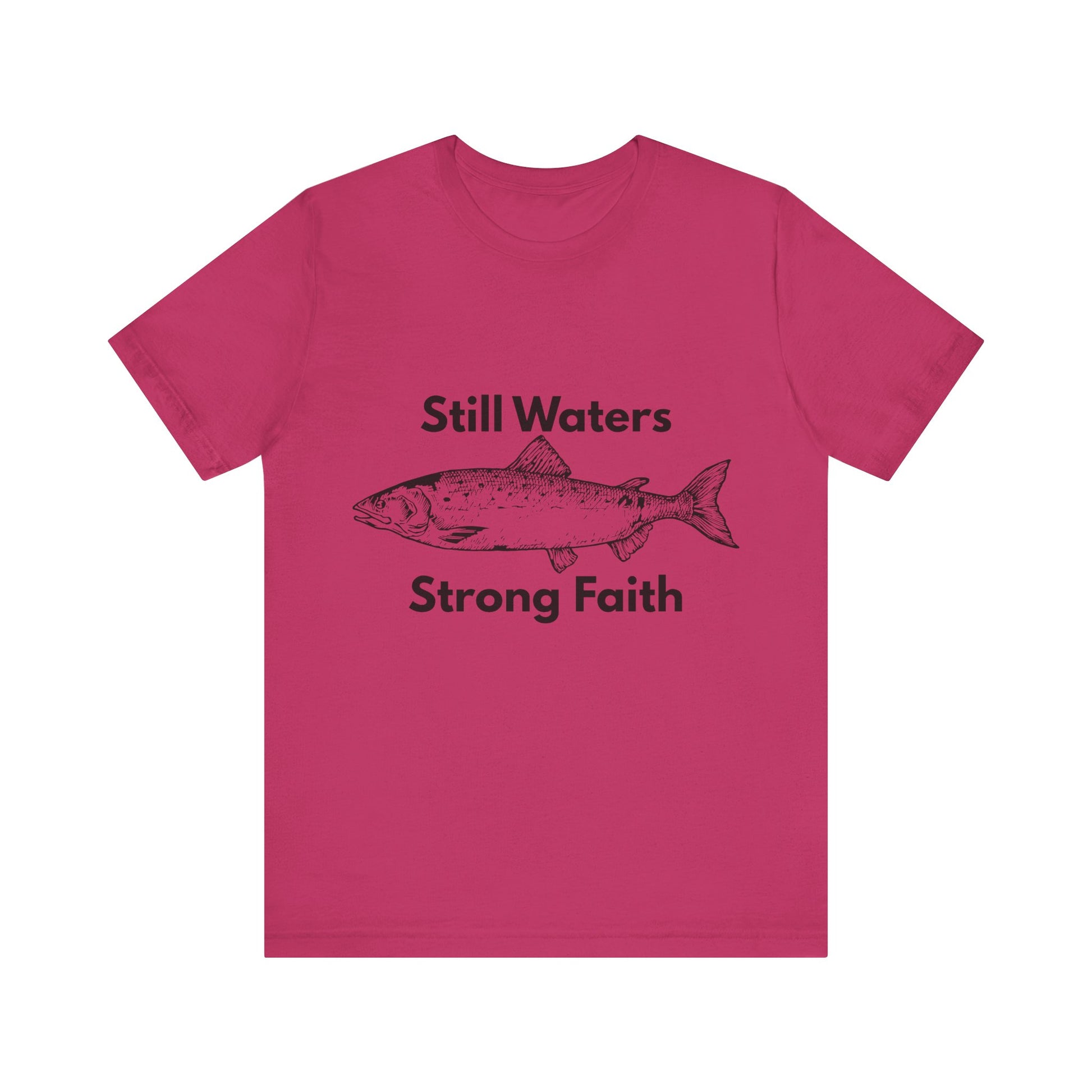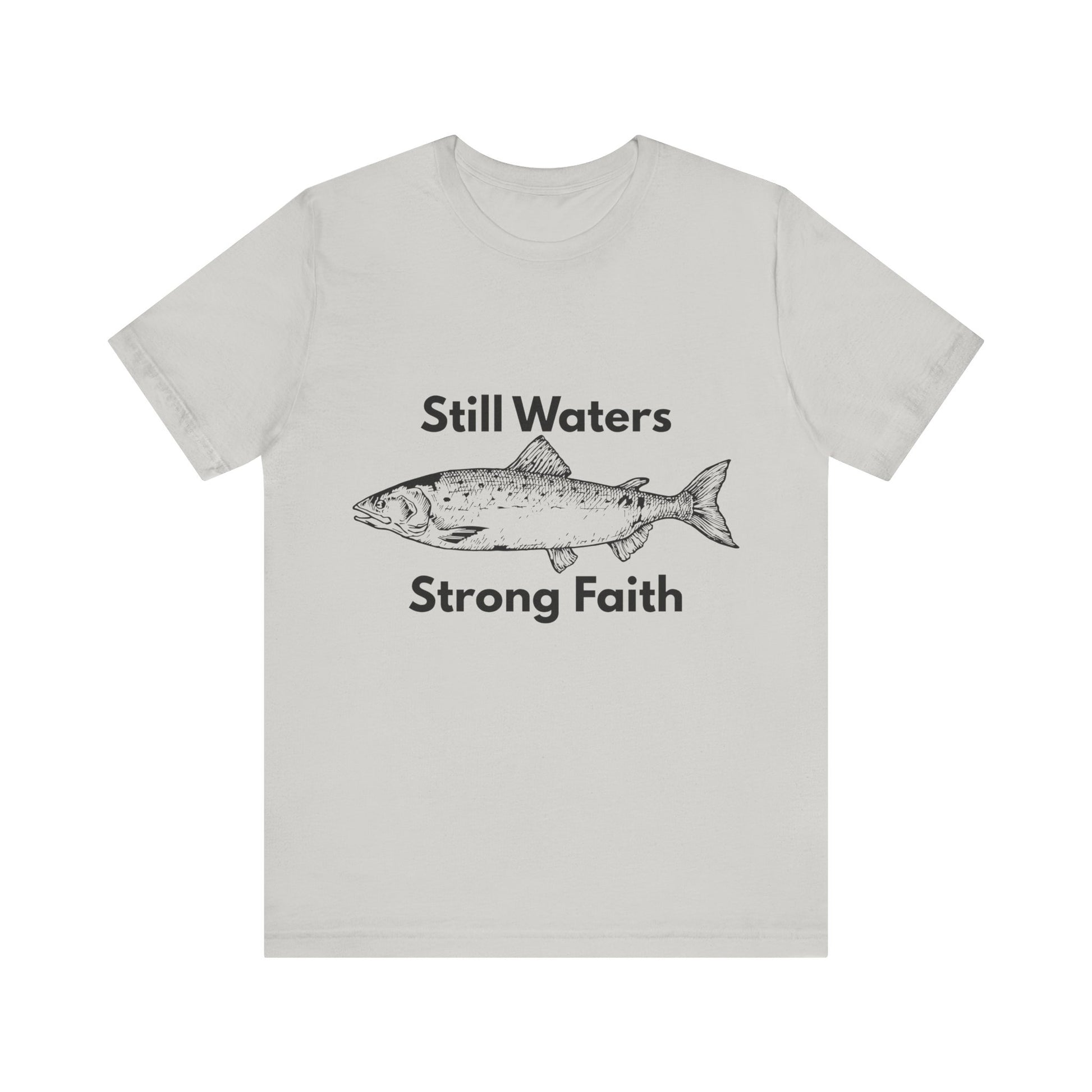 This clean, simple t-shirt pairs a minimalist fish design with the calming yet powerful phrase “Still Waters Strong Faith.” Inspired by Psalm 23 and the peace found in God’s presence, it encourages believers to remain steady in faith, even when life slows down or feels uncertain.
